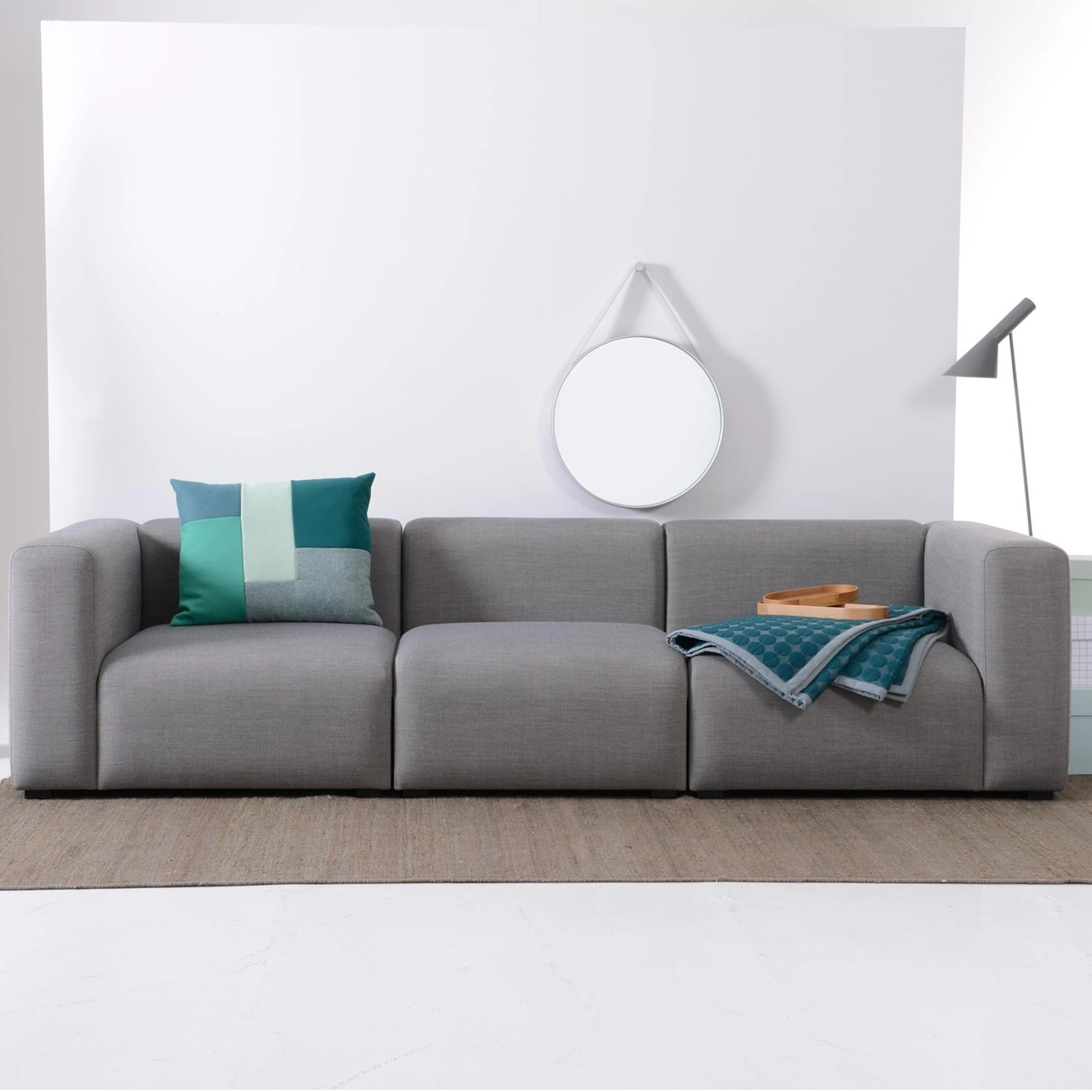 Das hier gezeigte Mags Sofa ist ein 3 Sitzer Sofa von HAY mit einer Länge von 268,5cm, und es besteht aus einem Buchenholz Rahmen, Polyurethanschaum und einem Bezug, der zu 90% aus Schurwolle und zu 10% aus Nylon hergestellt wird.