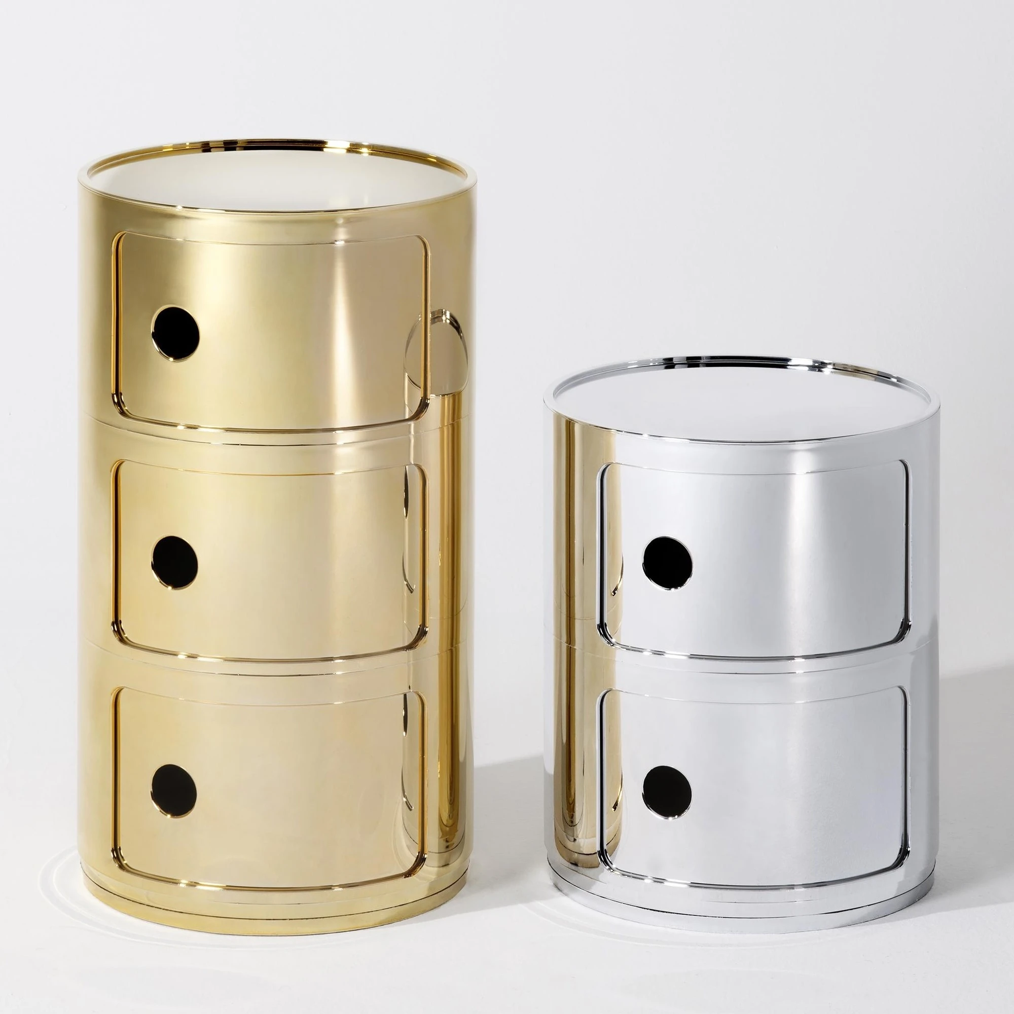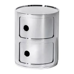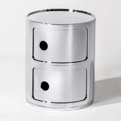 Der Componibili 2 Metallic Container wurde von Anna Castelli Ferrieri für die Marke Kartell entworfen. Er ist Teil einer Serie von Aufbewahrungsmöbeln, deren System auf einem Entwurfskonzept aus dem Jahr 1967 basiert. Die Kollektion umfasst modulare Modelle, die sich einfach übereinanderstapeln lassen.