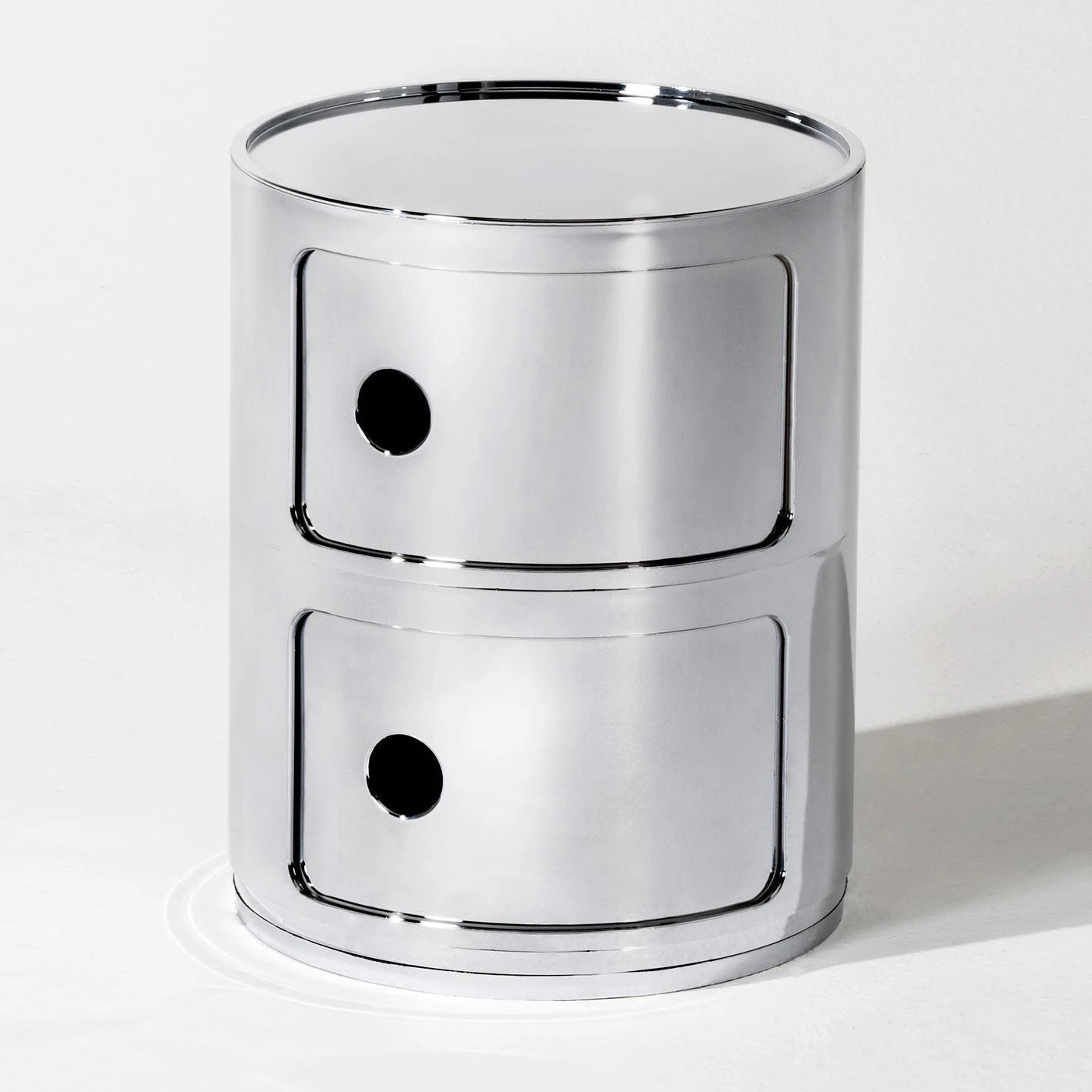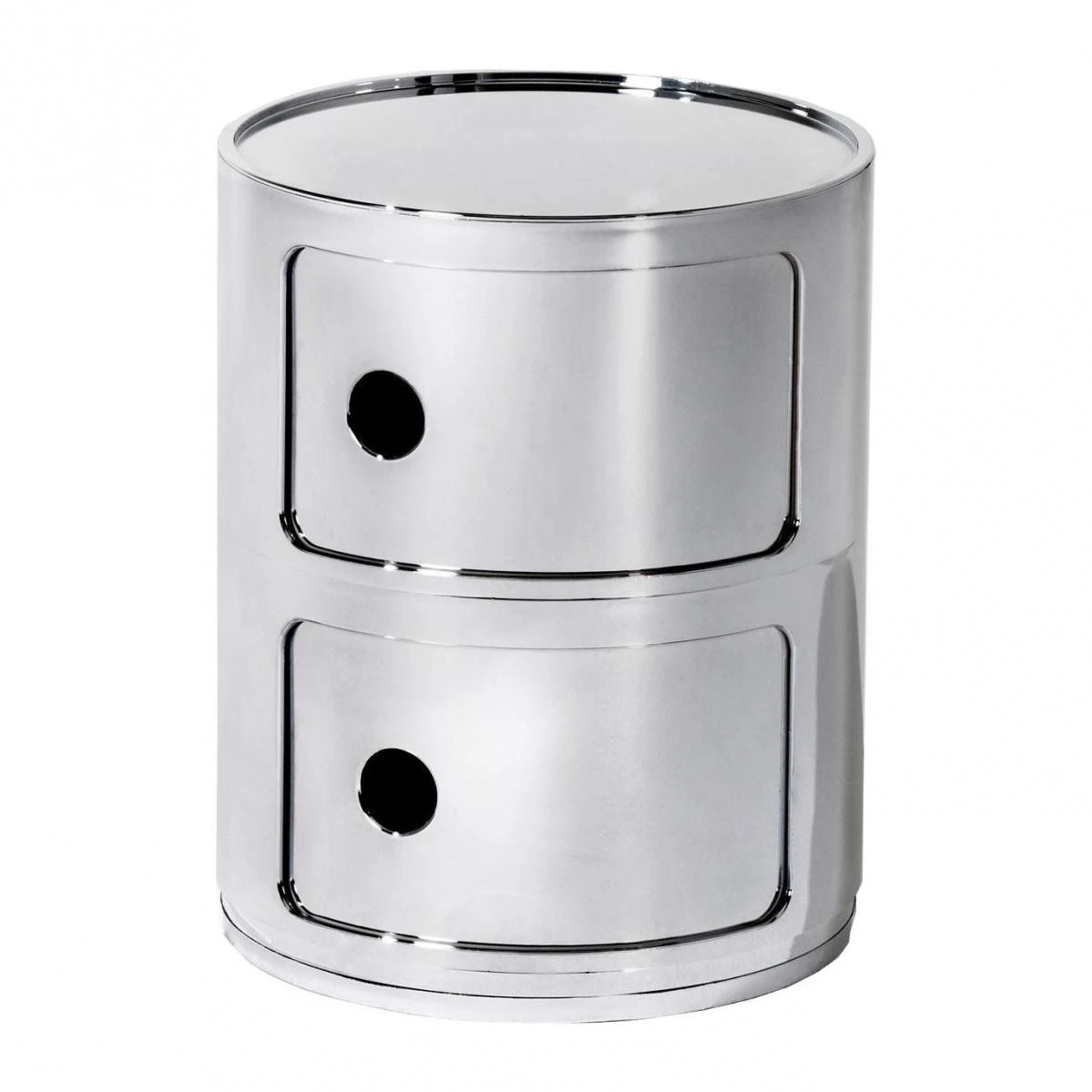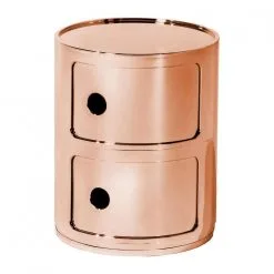 Einfach auf den Boden gestellt, dient der Componibili 2 Metallic Container als hübsches Ablagetischchen mit zwei Fächern. Das kompakte Aufbewahrungsmöbel kann aber auch auf einer Kommode oder in einem Regal platziert werden. Zusammen mit weiteren Modulen der Aufbewahrungsserie lässt sich der Componibili 2 Metallic Container dank seiner einfachen zylindrischen Form zu einer beliebig hohen Säule türmen. Dabei verhindern schmale Überstände an der Ober- und Unterseite, dass die einzelnen Module verrutschen. Die Fächer dienen zur Aufbewahrung von allerlei Kleinigkeiten, die dank der praktischen Schiebetürchen sauber verstaut sind. Zum seitlichen Öffnen gibt es an jedem Element ein kreisrundes Griffloch. Damit wird der Componibili 2 Metallic Container auch zum formschönen Hingucker in der Wohnung. Ebenso gut passt das Aufbewahrungsmöbel aus glänzendem metallisierten ABS-Kunststoff ins Büro.
