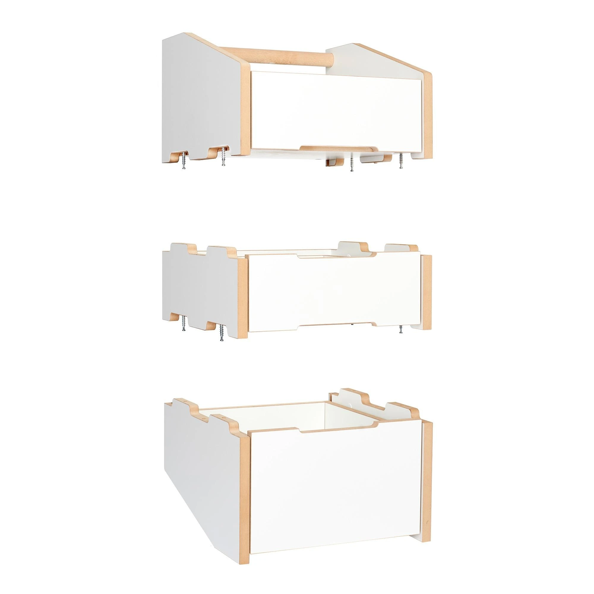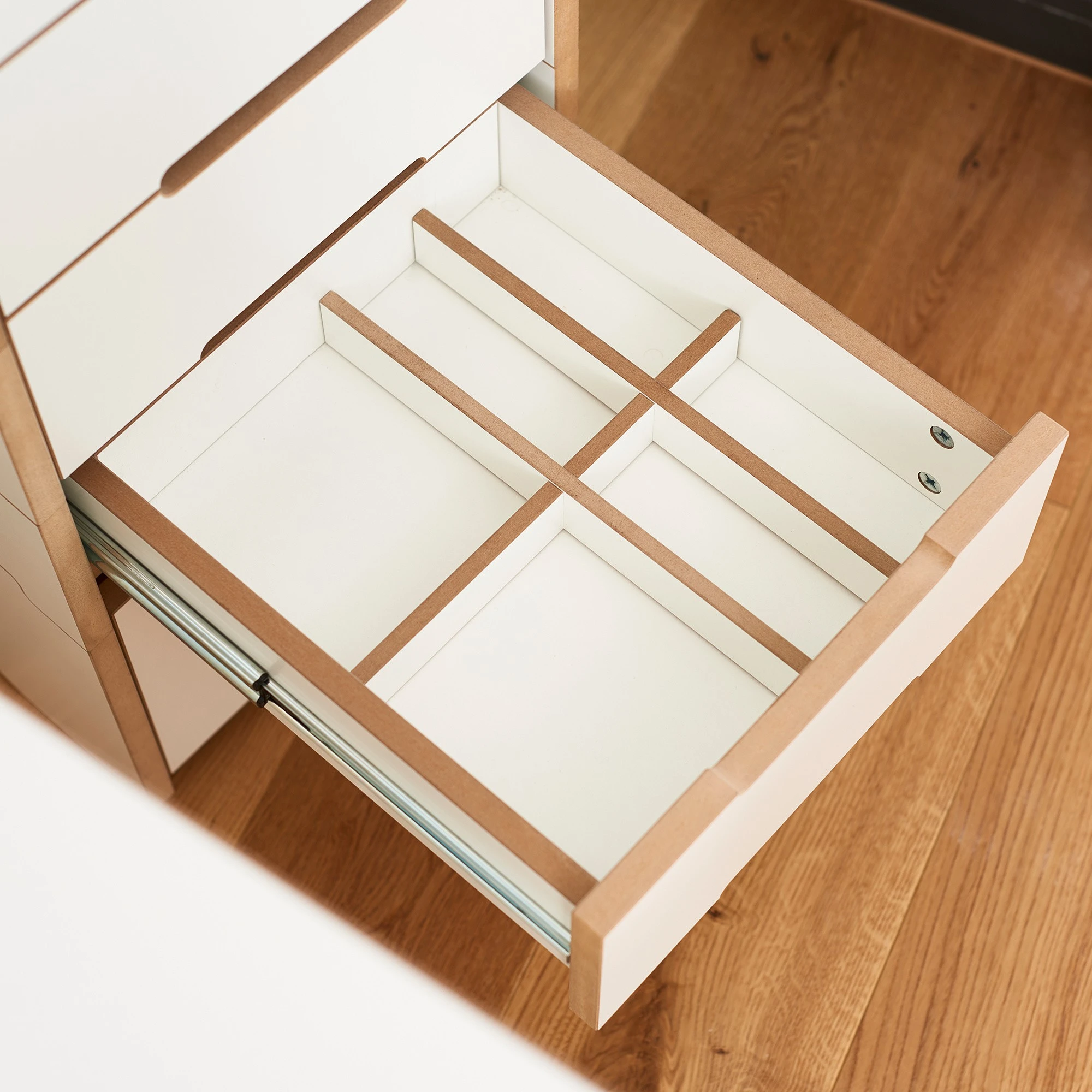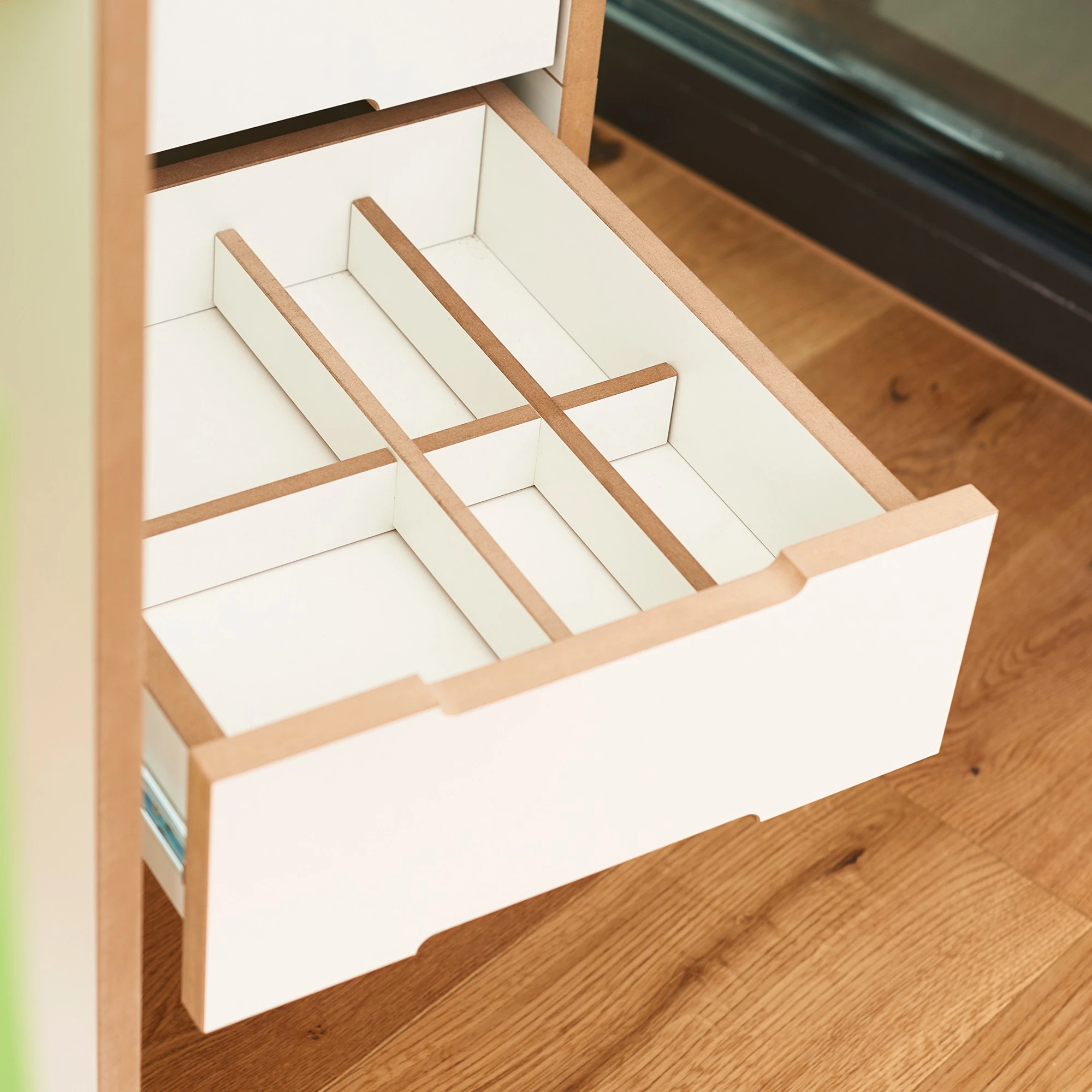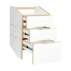 Wer ein praktisches und erweiterbares Möbelstück sucht, ist mit dem Cargo Rollcontainer bestens beraten. In das Grundmodul lassen sich Erweiterungen einsetzen. So wächst das Möbelstück mit, wenn mehr Stauraum benötigt wird. Der Cargo Rollcontainer ist aus MDF hergestellt. Die mitteldichte Holzfaserplatte wird mit Melaminharz versehen. Das macht den Cargo Rollcontainer zum robusten Möbelstück, das man leicht reinigen kann. Drei Schubladen sorgen für Ordnung am Arbeitsplatz oder im privaten Bereich. Die Platte an der Oberseite bildet eine praktische Abstellfläche. Am oberen Modul ist eine Stange befestigt. Damit kann man den Cargo Rollcontainer bequem navigieren. Dank der an der Unterseite befestigten Rollen kann man das Möbelstück leicht verschieben.
