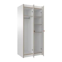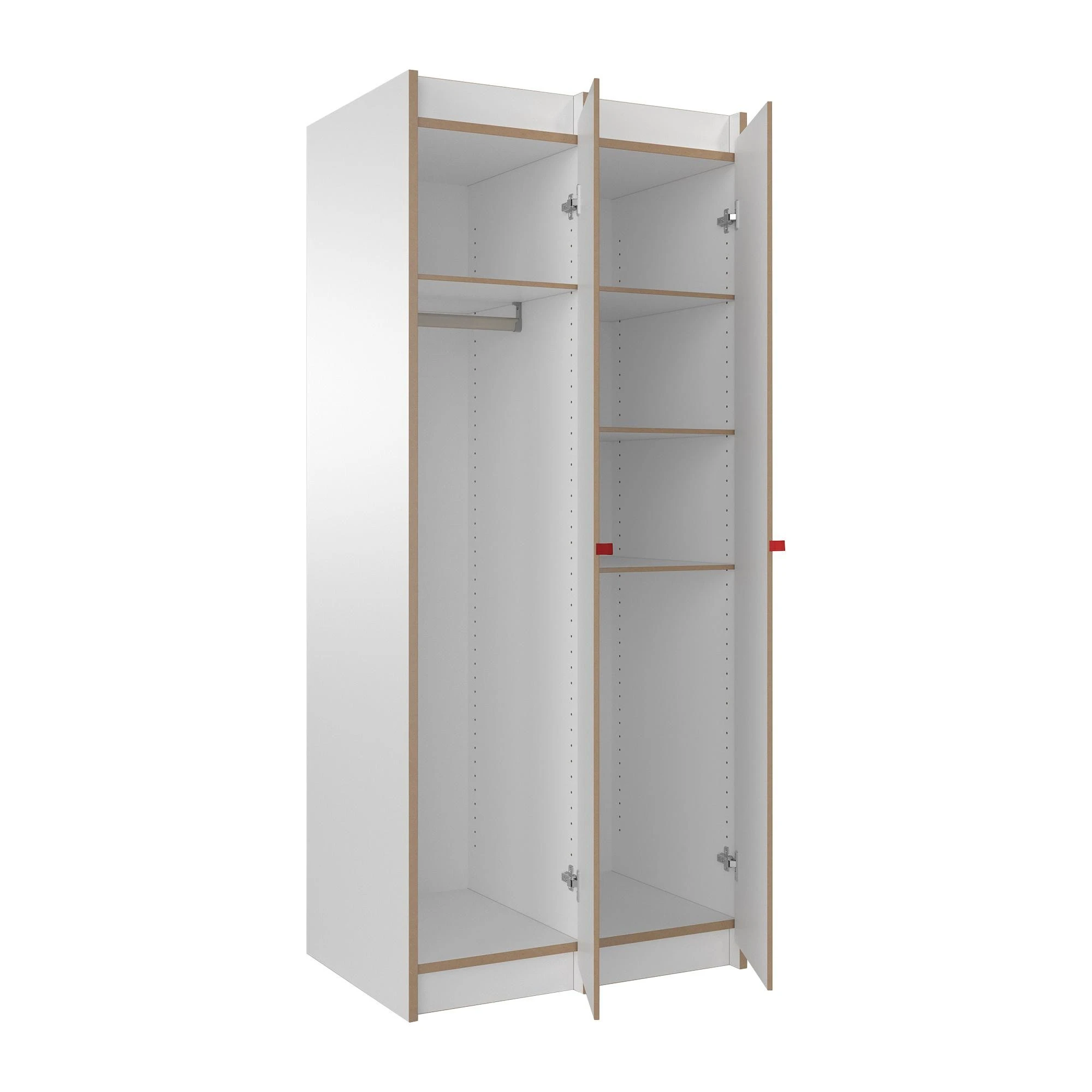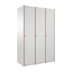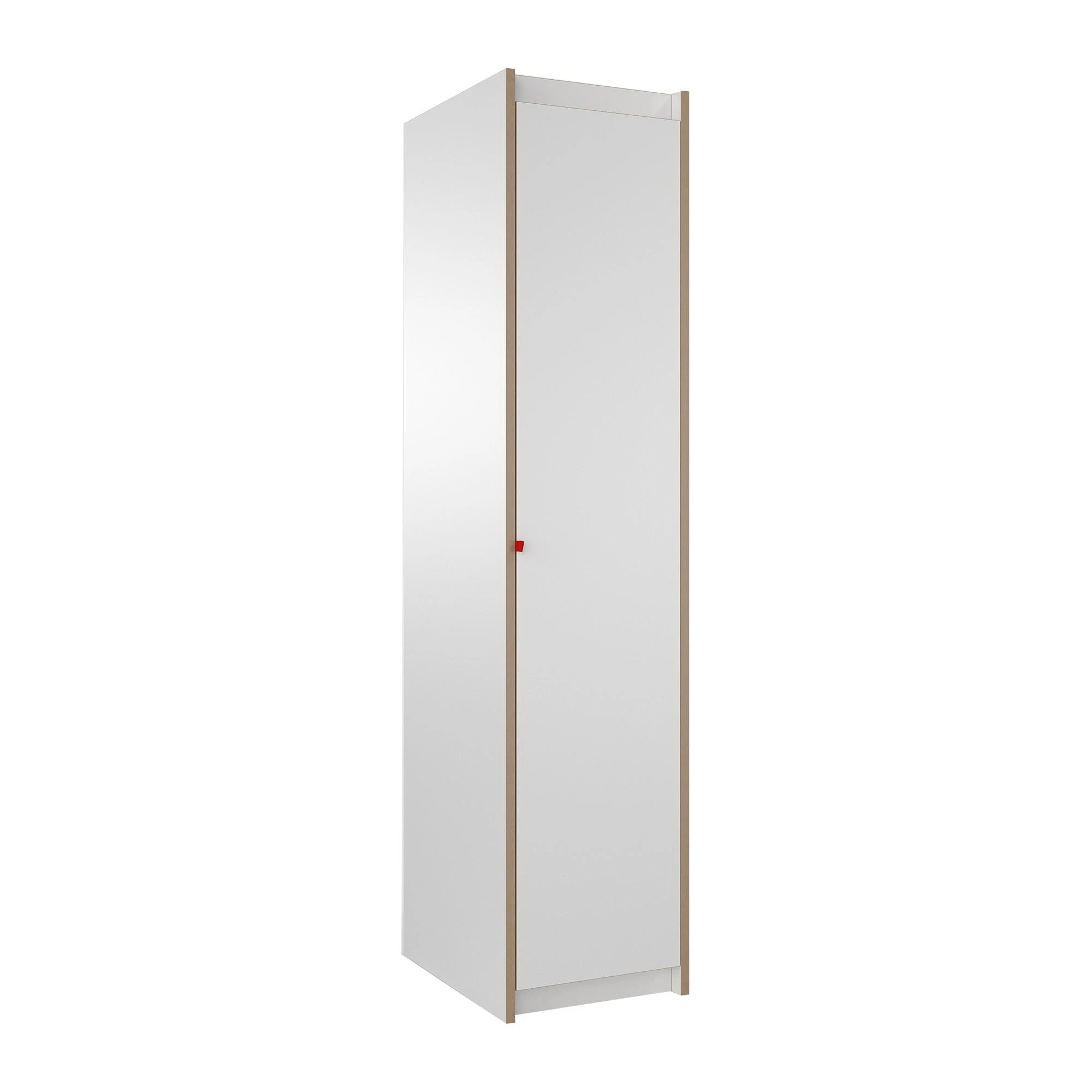 Das Steh Schrank Grundmodul ist im minimalistischen Stil gestaltet und harmoniert mit jeder Art der Einrichtung. Ein wenig erinnert das Modell an einen Spind, allerdings ist das Steh Schrank Grundmodul nicht aus Metall gefertigt. Die Designer verwenden beschichtetes, weißes MDF. Dabei handelt es sich um ein hochwertiges Laminat mit mittlerer Faserdichte. Es ist sehr pflegeleicht: So können die Oberflächen des Schranks mit einem feuchten Tuch abgewischt werden. Markenzeichen des Moduls ist der kleine knallrote Gurt, der zum Öffnen und Schließen der Schranktüre dient. Er bildet einen ansprechenden Kontrast zu den nüchternen Fronten. Wächst die Familie, kann man das Steh Schrank Grundmodul mit dem Steh Anbaumodul erweitern und mehr Raum für Kleidung und Utensilien schaffen.